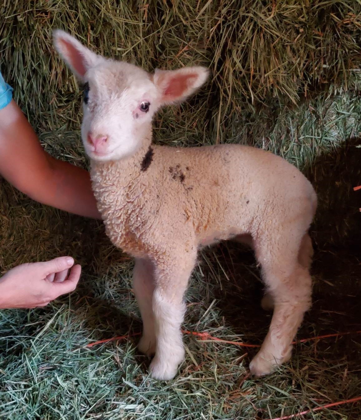 Lamb frolics in meadow.